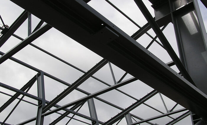 Dachtragwerk bestehend aus Stützen, Blechträger, bis zu 23,5m langen Fachwerkbinder und Pfetten.
