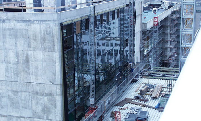 6-geschossige Fachwerkkonstruktion als Tragstruktur für Betondecken und Glasfassaden. Verarbeiteter Stahl 2500 Tonnen.