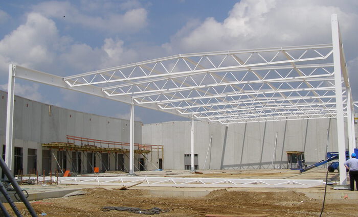 Dachtragwerk bestehend aus Stützen, Blechträger, bis zu 23,5m langen Fachwerkbinder und Pfetten.