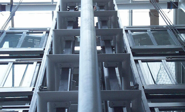 Aufzugsgerüsten. Komplett verschweißte Stahlkonstruktion aus Rundrohrprofilen. Montage in Modulen mit Baustellenverschweißungen.